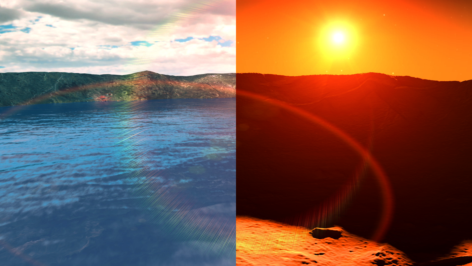 Rappresentazione artistica dell’ambiente marziano primitivo (a sinistra) – che si ritiene contenesse acqua liquida e un’atmosfera più densa – rispetto all’attuale ambiente freddo e secco. Maven orbita attorno a Marte per studiare la sua atmosfera superiore, la ionosfera e le interazioni con il Sole e il vento solare. Gli scienziati stanno usando i dati di Maven per determinare il ruolo che la perdita di sostanze volatili dall’atmosfera di Marte allo spazio ha avuto nel tempo, fornendo informazioni sulla storia dell’atmosfera e del clima di Marte, sull’acqua liquida e sull’abitabilità planetaria. Crediti: Nasa’s Goddard Space Flight Center