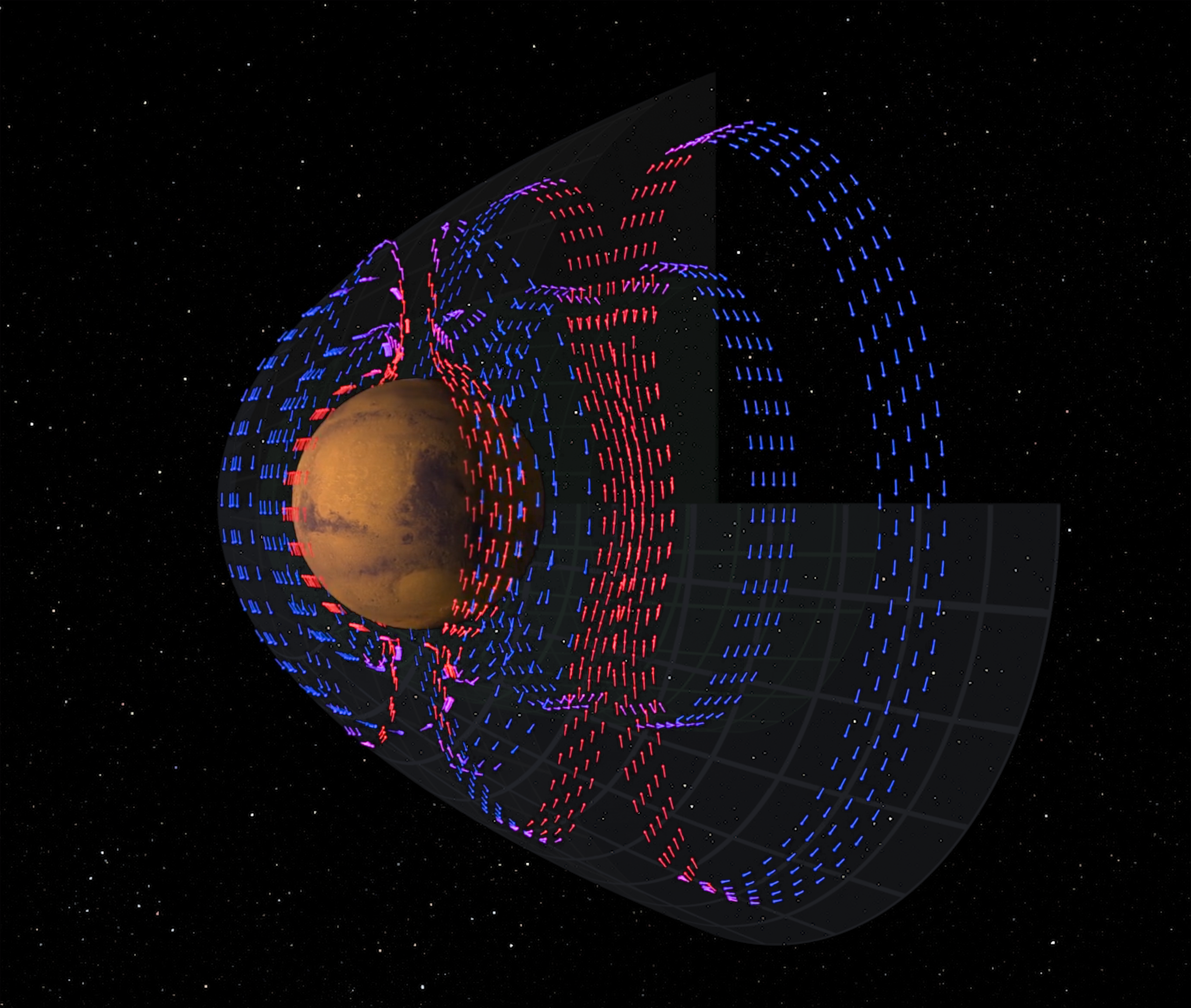 Il magnetismo terrestre proviene dal suo nucleo dove il ferro fuso, elettricamente conduttore, scorre sotto la crosta. Il suo campo magnetico è globale, il che significa che circonda l’intero pianeta. Poiché Marte è un pianeta roccioso, come la Terra, si potrebbe supporre che su di esso si verifichi la stessa cosa. Tuttavia, Marte da solo non genera un campo magnetico, se non piccole zone di crosta magnetizzata. È chiaro quindi che sul Pianeta rosso deve accadere qualcosa di diverso da ciò che osserviamo sulla Terra.