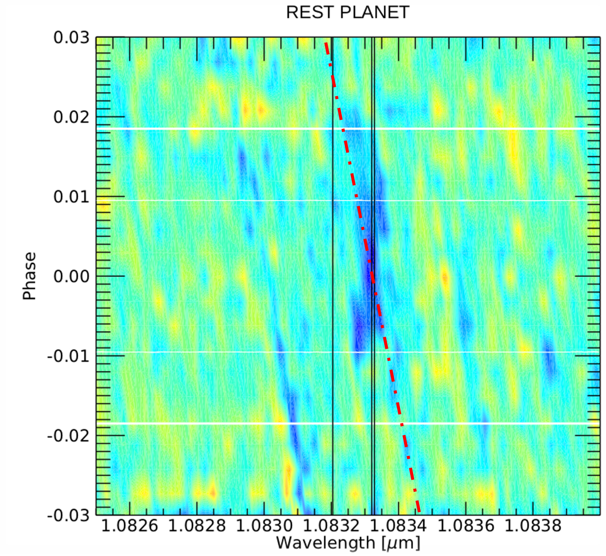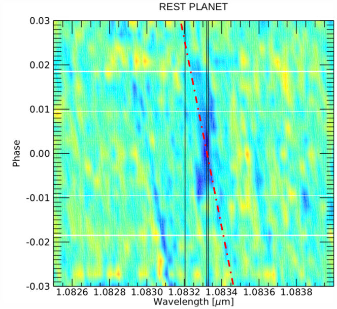 Spettri di trasmissione in funzione della fase e dalla lunghezza d’onda nel sistema di riferimento del pianeta ottenuti dalla combinazione di tutte e 5 le notti di osservazione. In blu si può vedere il segnale di elio. Grazie all’alta risoluzione spettrale di Giano-B, si può stabilire con certezza che il segnale è di origine planetaria in quanto è allineato nel sistema di riferimento del pianeta. Se il segnale fosse stato di origine stellare avrebbe dovuto seguire la linea tratteggiata in rosso. Crediti: G. Guilluy et al.