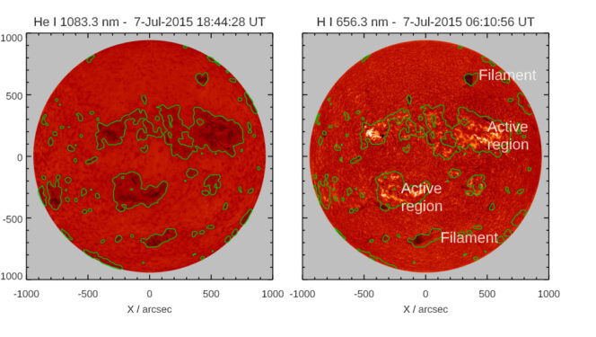 Mappe del Sole in He λ~1083.3 nm (sinistra) e Hα (destra). Nelle regioni attive, la riga infrarossa dell’elio e la riga Halpha dell’idrogeno hanno un comportamento opposto: più intensa la riga dell’elio, meno intensa quella dell’idrogeno. Crediti: G. Guilluy et al.