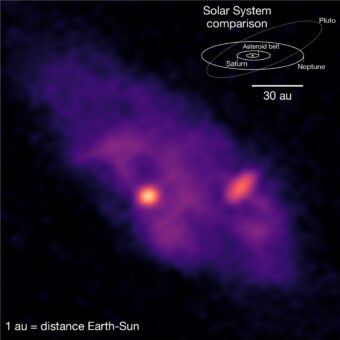Vista dettagliata del sistema binario protostellare con un raffronto dimensionale al Sistema solare. La separazione tra le sorgenti A1 e A2 è approssimativamente pari al diametro dell’orbita di Plutone. La dimensione del disco attorno ad A1 (non risolto) è pari circa al diametro della cintura di asteroidi. La dimensione del disco attorno a A2 è circa delle dimensioni dell’orbita di Saturno. Crediti: Mpe