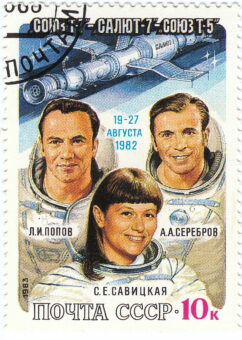 Un francobollo sovietico del 1983 raffigurante Leonid Popov, Svetlana Savitskaya e Aleksandr Serebrov.