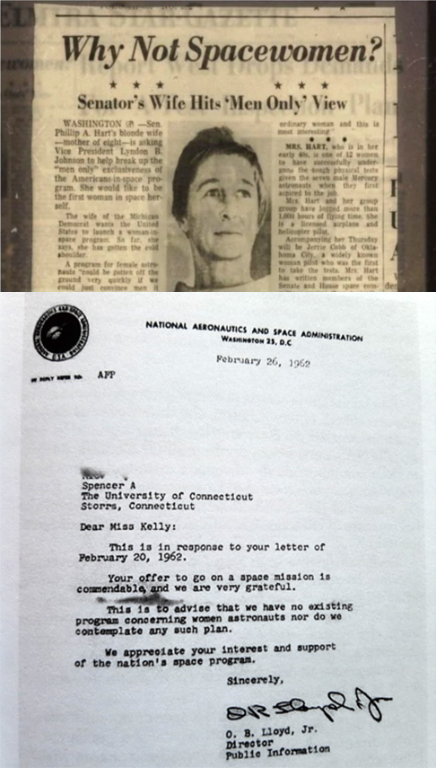 In alto, un articolo su un giornale dell’epoca riporta la protesta di Janey Hart – una delle “Mercury 13” – contro l’esclusione delle donne dalle imprese spaziali. In basso, una lettera del 1962 con la quale la Nasa respingeva la candidatura ad astronauta di una tale “miss Kelly” del Connecticut