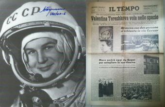 A sinistra, Valentina Tereshkova. A destra, la prima pagina de “Il Tempo” sul lancio nello spazio della cosmonauta