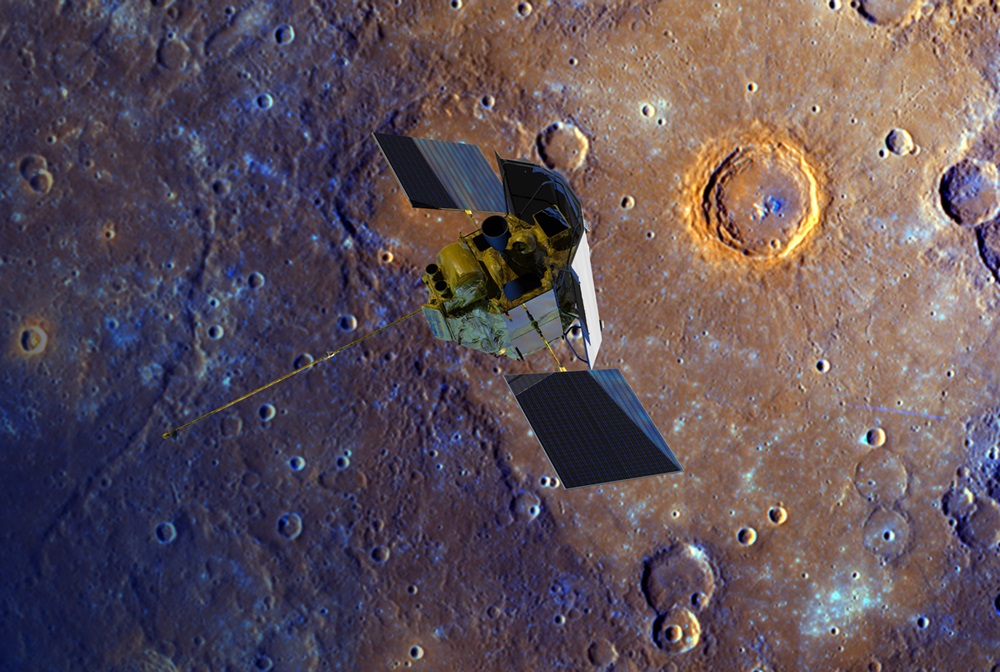 Impressione artistica della sonda spaziale Messenger in orbita attorno a Mercurio. Crediti: Nasa/Johns Hopkins University Applied Physics Laboratory/Carnegie Institution of Washington