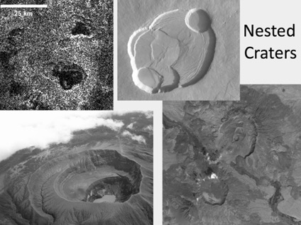 Confronto tra crateri innestati su Titano (in alto a sinistra), su Marte (in alto a destra) e sulla Terra (in basso). Crediti: Planetary Science Institute