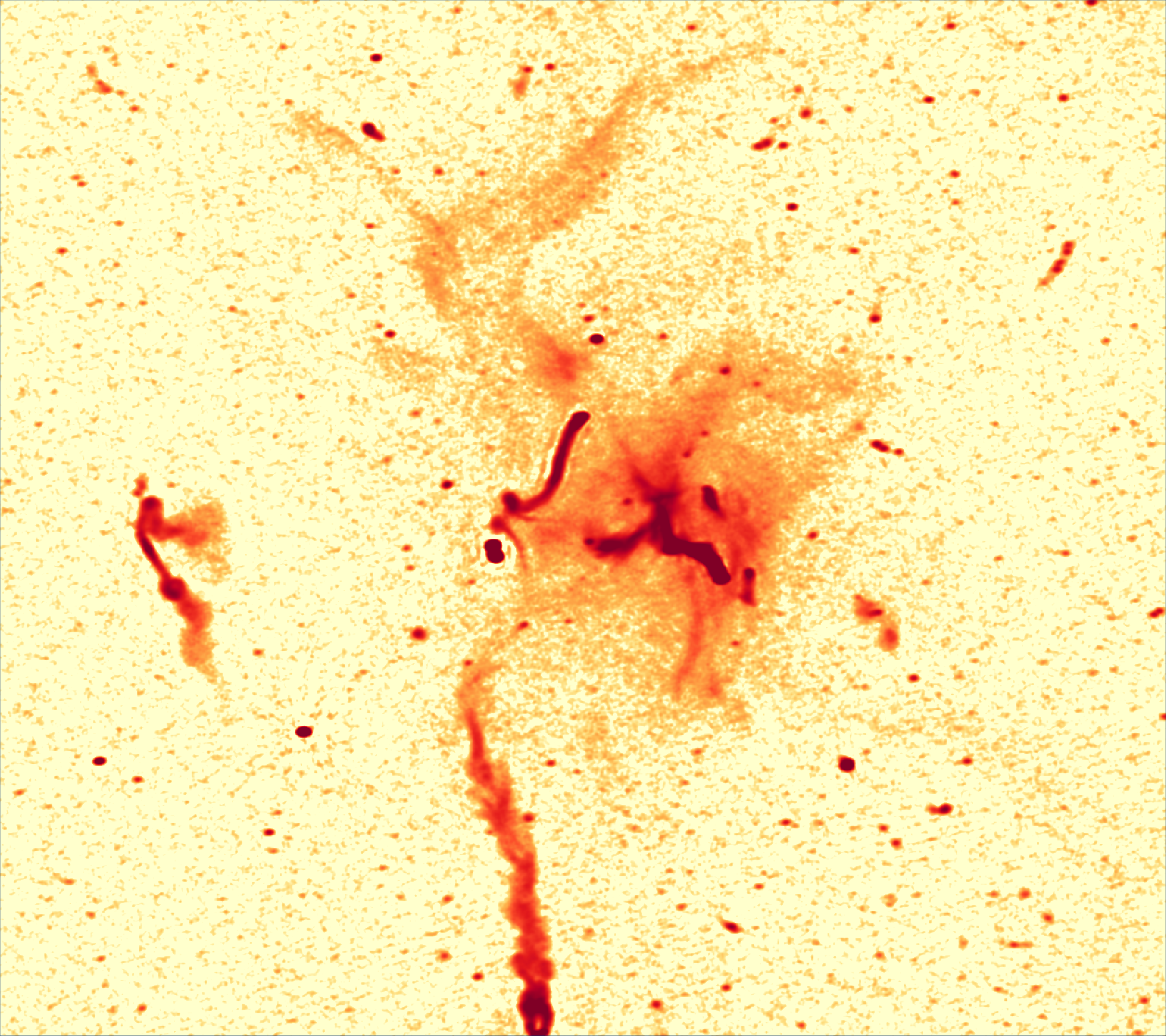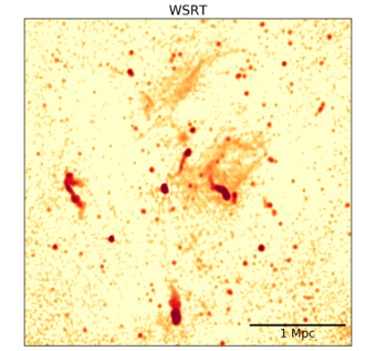 - Immagine radio dell’ammasso di galassie Abell 2255 ottenuta da un’osservazione da 48 ore effettuata 10 anni fa con il radiotelescopio Wsrt ( Crediti: Pizzo et al. 2009)
