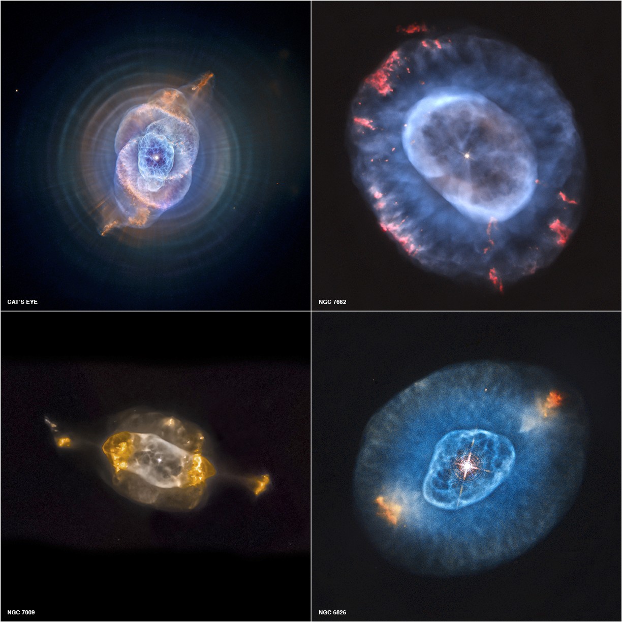 Quattro splendide immagini di nebulose planetarie che fotografano le ultime fasi di vita delle stelle di piccola massa, mentre si spogliano del loro inviluppo gassoso eiettandolo nel cosmo. Il gas espulso è arricchito di nuovi elementi chimici, incluso il carbonio, da poco prodotti negli interni caldi della stella. ll piccolo punto bianco al centro di ogni immagine è la futura nana bianca, un oggetto molto compatto destinato a raffreddarsi per sempre. Crediti: Nasa/Stsci