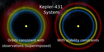 Dei tre pianeti rilevati nel sistema Kepler-431 non si conoscono con esattezza le orbite. Il gruppo di ricerca internazionale guidato dal Daniel Tamayo, di Princeton, ha rimosso tutte le configurazioni instabili che avrebbero da tempo portato a uno scontro fra i pianeti. Tutto grazie a un algoritmo che impiega appena 14 minuti per calcolare le configurazioni possibili. Crediti: Daniel Tamayo