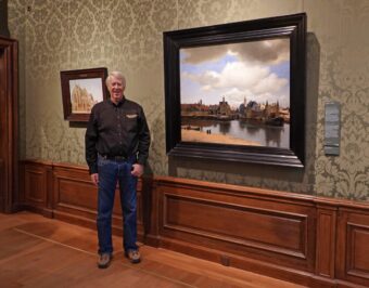 Don Olson accanto alla Veduta di Delft di Jan Vermeer al Mauritshuis museum dell’Aia, nei Paesi Bassi