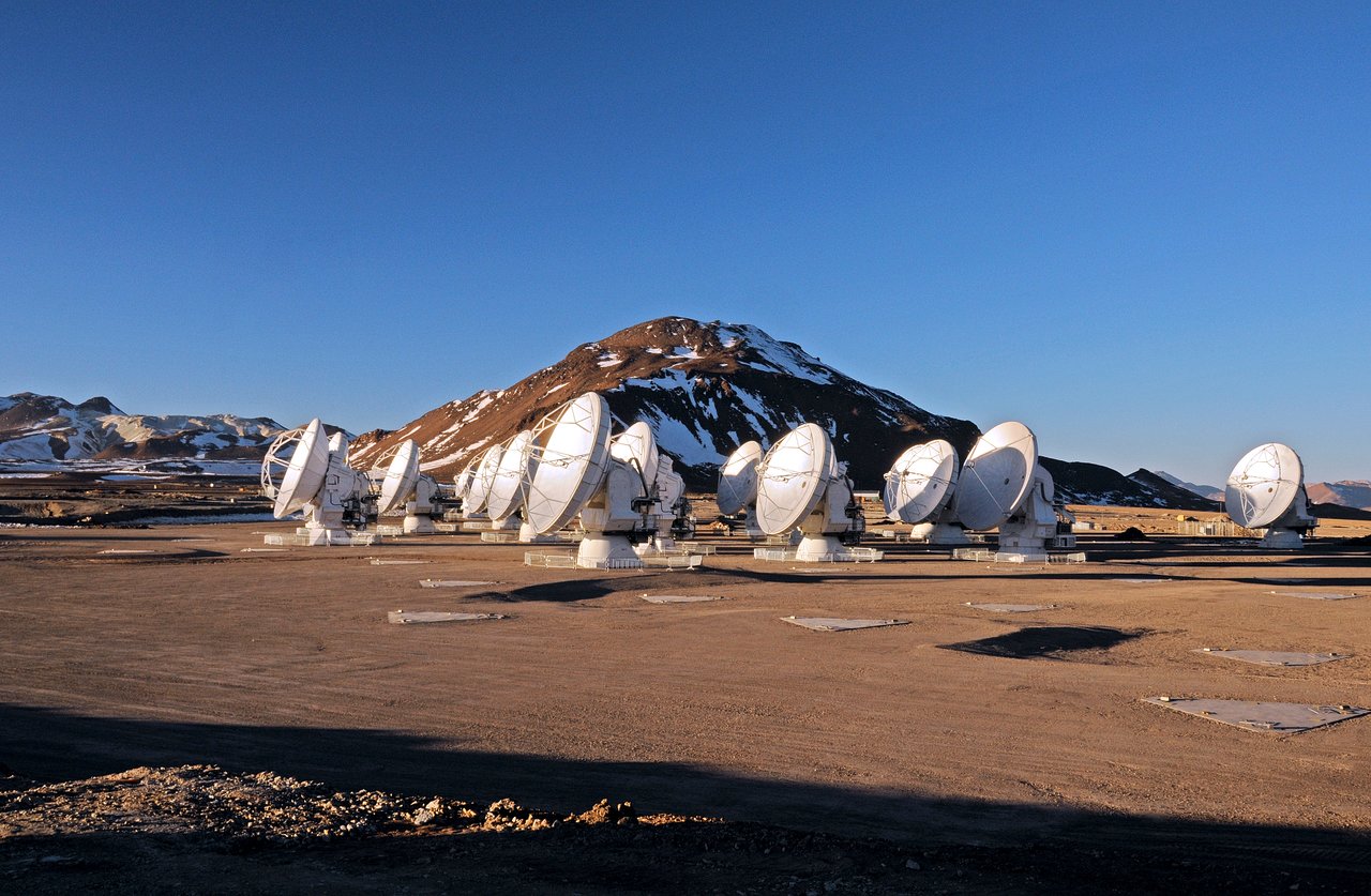 Alcune delle 66 antenne che compongono il telescopio Alma, sull’altopiano di Chajnantor nelle Ande cilene, a 5000 metri sul livello del mare. Crediti: Alma (Eso/Naoj/Nrao)/W. Garnier (Alma)