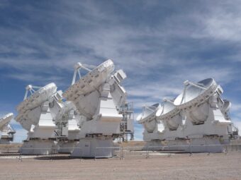Il cuore di Alma è l’Atacama Compact Array. Questi piccoli telescopi parabolici da 7 metri, affiancati da alcuni più grandi da 12 metri, si stanno praticamente toccando l’un l’altro per simulare un singolo telescopio. Quando le loro viste del cielo vengono combinate, possono vedere oggetti molto deboli. Crediti: T. Burchell, Nrao/Nsf/Aui