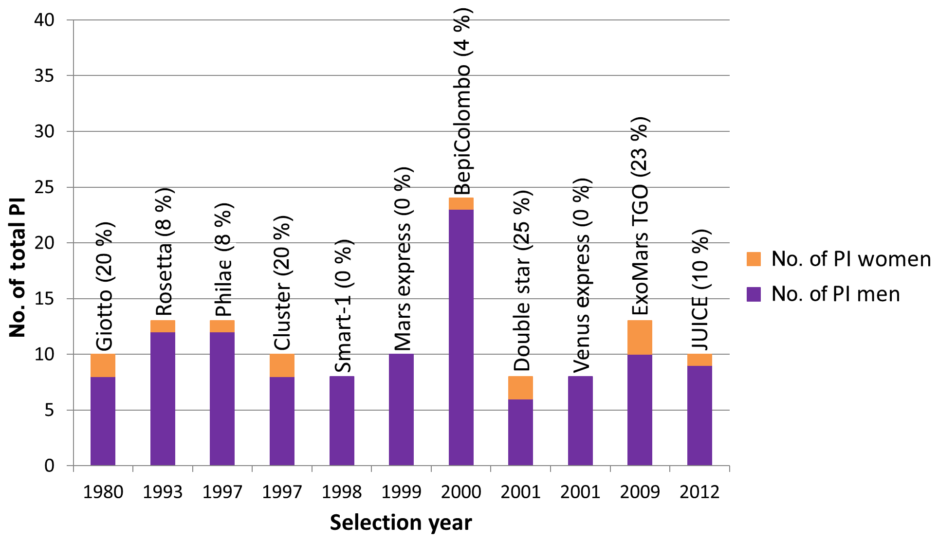 Il numero dei principal investigators in dieci missioni Esa. L’asse x indica l’anno in cui è stata selezionata la missione. Ogni barra mostra il numero di uomini (viola) e donne (arancione) del team iniziale. La percentuale di donne è tra parentesi. Crediti: Piccialli et al., 2020.
