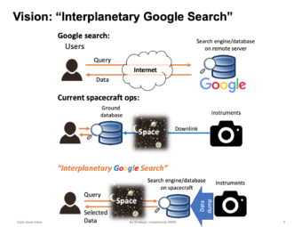 Ma sarà molto più veloce anche l’analisi dei dati, e dunque la scienza che si potrà fare. Per spiegare in che senso, Ono e colleghi usano un’analogia con le ricerche su Google. Qui sulla Terra, quando vogliamo cercare qualcosa in rete, inviamo la nostra query ai server di Google e quelli più o meno istantaneamente rispondono (vedi la prima riga nello schema qui sopra). Per “interrogare Marte”, invece, l’istantaneità ci è preclusa. Se, per esempio, volessimo sapere “quanti sassi con diametro superiore a 20 cm ci sono nel raggio di 50 metri”, dovremmo prima chiedere al rover d’inviarci le immagini ad alta risoluzione della regione che lo circonda, e solo una volta che quella notevole mole di dati sarà stata scaricata nel server qui sulla Terra potremmo interrogare il database (seconda riga). A un rover “intelligente” – un rover in grado di catalogare i sassi in base alle loro dimensioni, per esempio, o magari in base al materiale di cui sono fatti – potremo invece inviare direttamente la nostra query (terza riga): l’elaborazione dei dati avverrebbe sul posto, con un database e con la cpu a bordo del rover stesso, consentendoci di abbattere i tempi d’interrogazione e di poter fare molte più domande. E dunque molta più scienza.