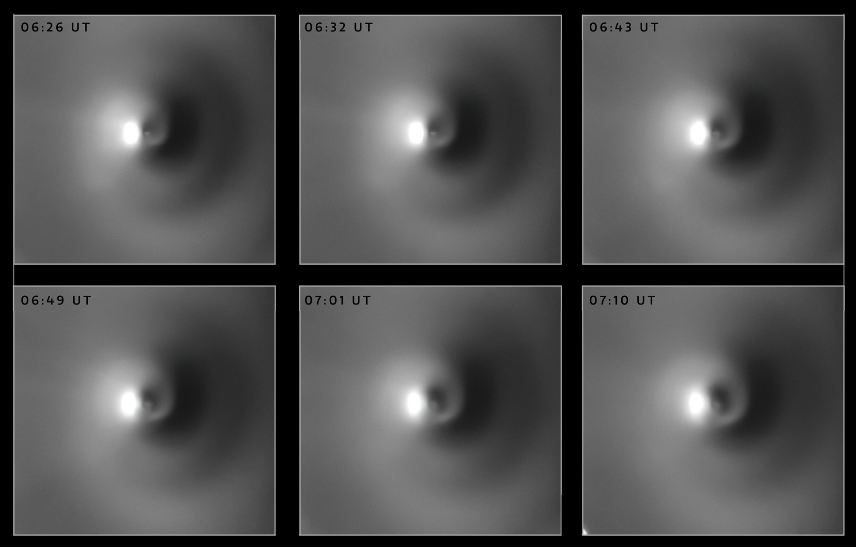 L’impresa è riuscita – fra gli altri – a due astronomi polacchi, Michal Drahus e Piotr Guzik dell’Università Jagellonica di Cracovia, che per le loro osservazioni hanno avuto accesso al telescopio Gemini North (del diametro di 8 metri), sito sul Maunakea, nelle Hawaii. Insieme ai colleghi del loro team, i due astronomi hanno ripreso immagini del nucleo della Neowise dal 28 luglio al 10 agosto. La sequenza di immagini della figura qui sotto mostra i getti di gas che, muovendosi secondo una traiettoria a spirale, stanno lasciando il nucleo. L’evoluzione temporale dei getti – di cui si può vedere una animazione nel video qui sopra – ha permesso di stimare il periodo di rotazione del nucleo, pari a 7,58 ore con un’incertezza di più o meno 2 minuti. Questo valore è coerente con quanto stimato in precedenza da altri osservatori. Il risultato sul periodo di rotazione del nucleo è stato comunicato alla comunità con l‘ATel #13945, cui seguirà l’articolo scientifico vero e proprio. Si tratta di un risultato molto interessante perché sono pochi i nuclei cometari di cui si conosce il periodo, ottenuto senza poter vedere direttamente il nucleo. Cerchiamo di capire come si forma la struttura a spirale che caratterizza la parte interna della chioma della Neowise.