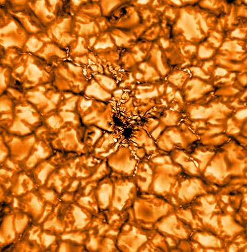 Una macchia solare osservata ad alta risoluzione dal telescopio Gregor, alla lunghezza d’onda di 430 nanometri. Credito: Kis