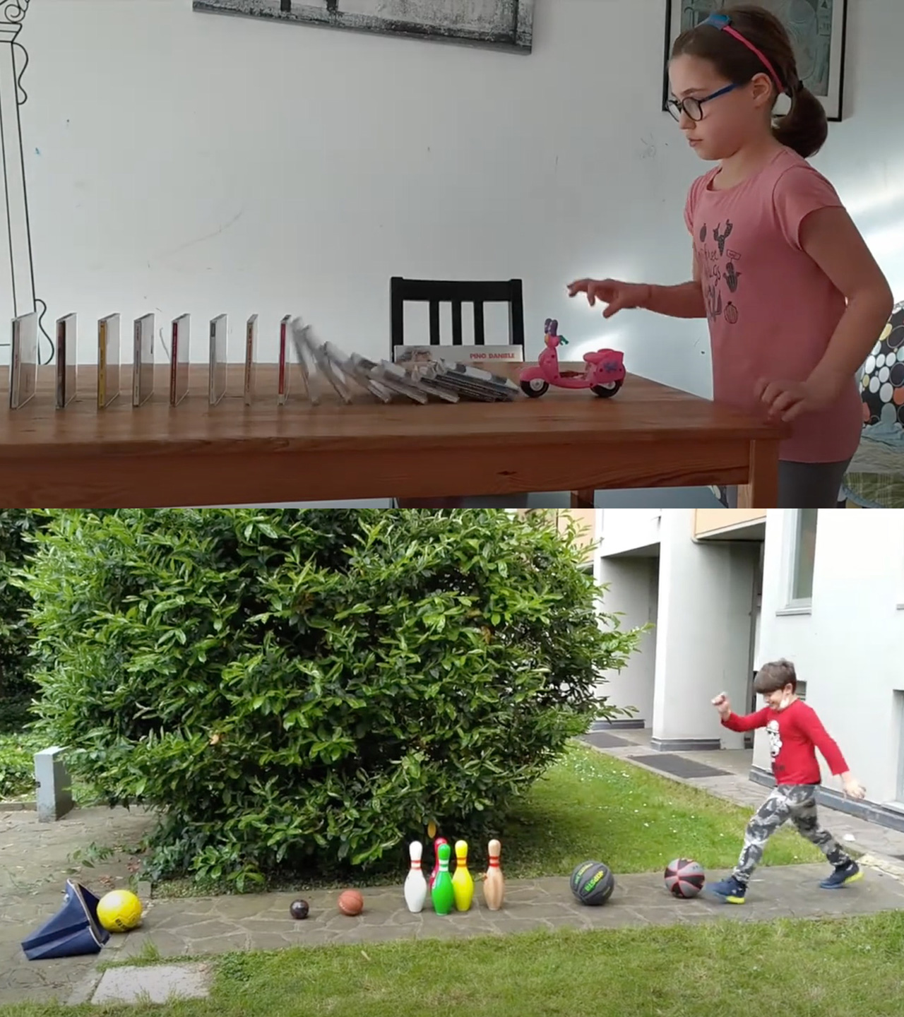 C’è solo una cosa più gratificante del creare: il distruggere – come del resto ci insegna anche Jep Gambardella. Se non ci credete, guardate con i vostri occhi come se la sono spassata le studentesse e gli studenti delle scuole primarie che, durante il lockdown, hanno risposto all’invito a dar vita, fra le pareti domestiche, a una reazione a catena. E poiché per distruggere è – ahimè – prima inevitabile creare qualcosa, messi da parte tablet e computer hanno fatto man bassa dei dinosauri di fratelli e sorelle, dei cd dei genitori e di tutto quel che gli è capitato sott’occhio per realizzare percorsi e scatenare effetti domino indimenticabili.