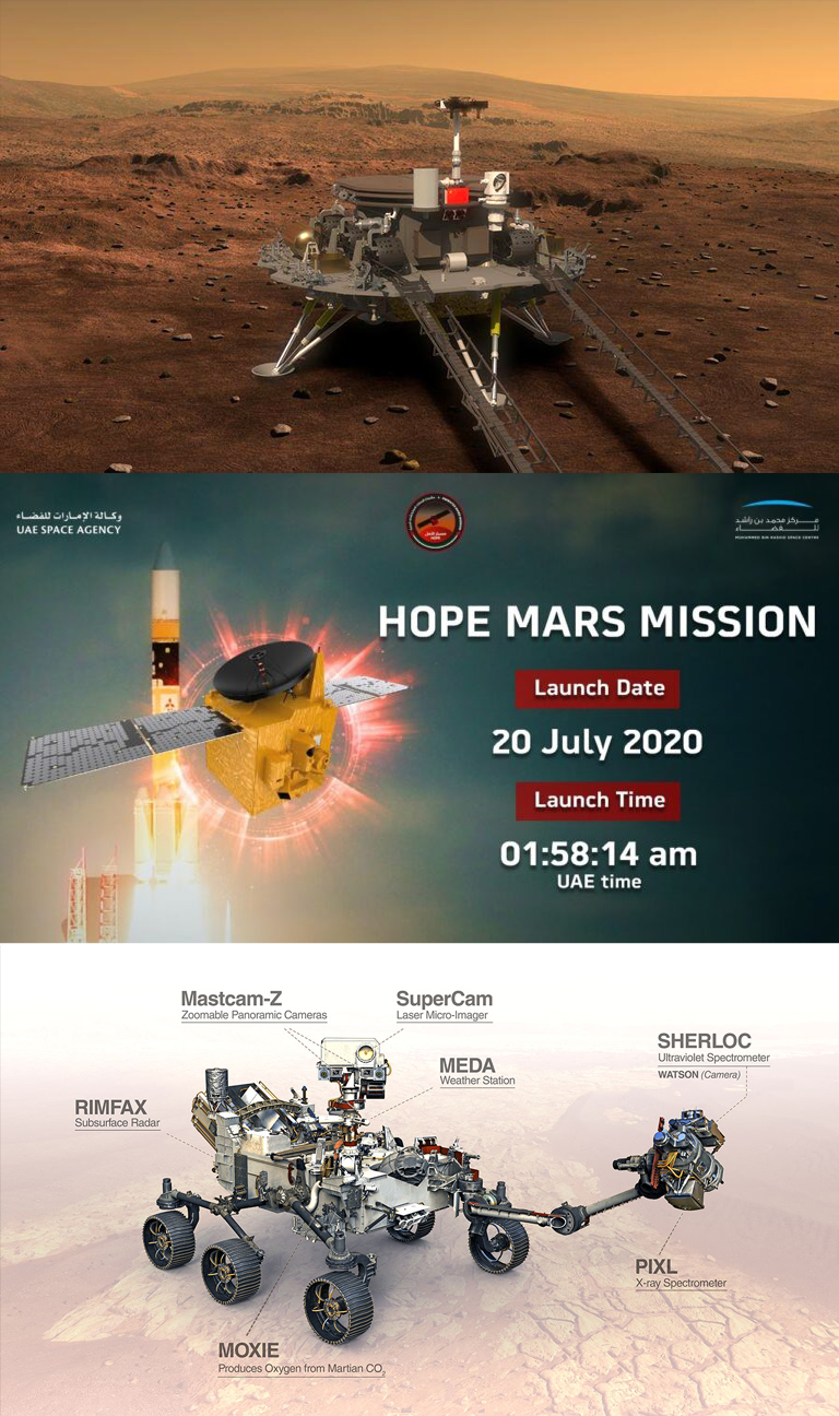 La prima a partire è stata la sonda Al Amal (Speranza) costruita dalla giovanissima agenzia spaziale degli Emirati arabi. È stata lanciata il 20 luglio dalla agenzia spaziale giapponese dalla base nell’isola di Tanegashima. La squadra dei tecnici e scienziati emiratini è dovuta partire in anticipo per il Giappone per poter rispettare la quarantena obbligatoria prima di mettersi al lavoro.