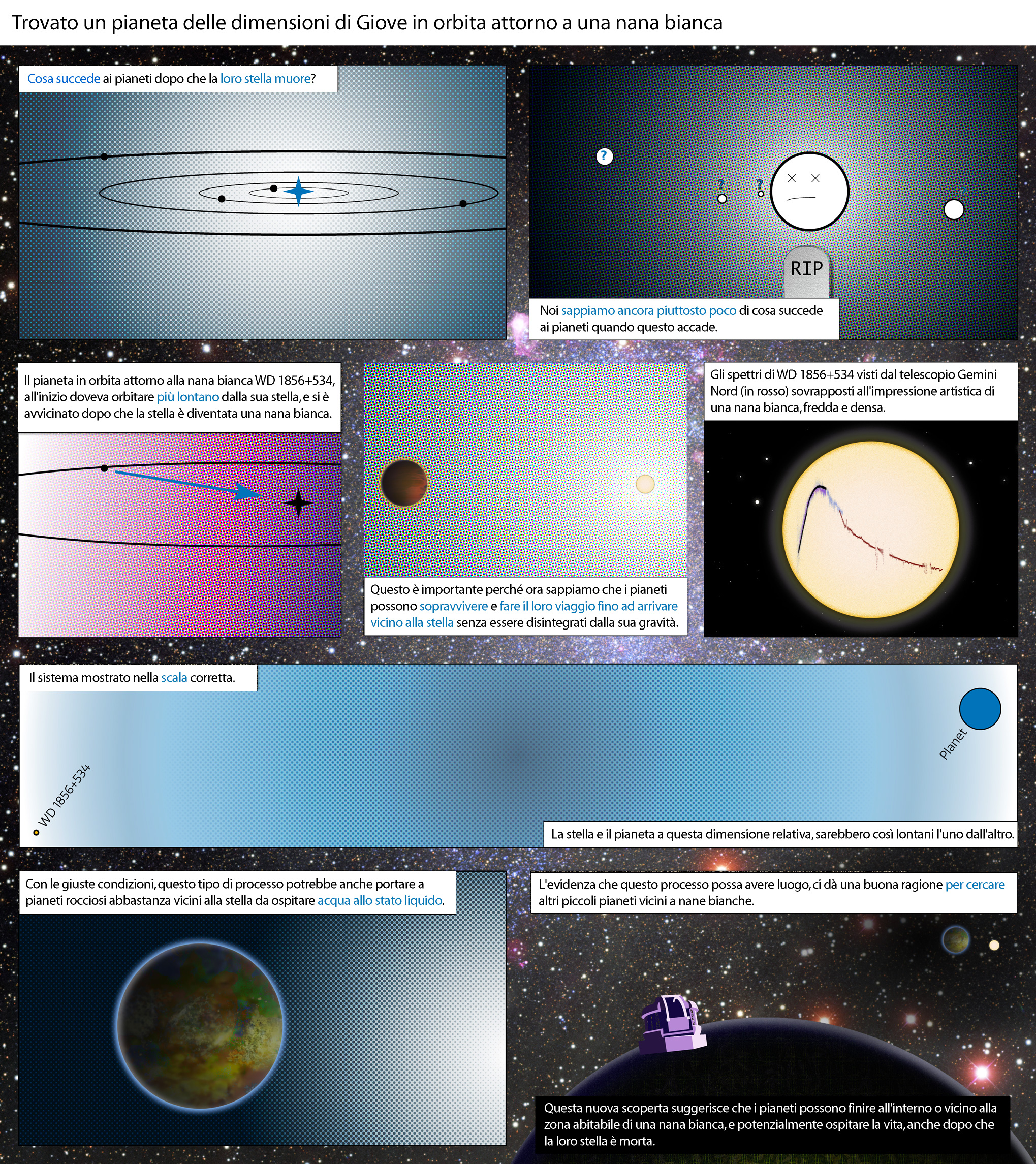 Sebbene in passato si siano riscontrati indizi di grandi pianeti in orbita vicino a nane bianche, la nuova scoperta è la prova più evidente dell’esistenza di questi bizzarri accoppiamenti. Questa conferma evidenzia il fatto che i sistemi stellari possono evolversi in diversi modi, e permette di intravvedere un possibile destino del Sistema solare. Un tale sistema potrebbe anche rappresentare una rara sistemazione abitabile per un’ipotetica vita sostenuta dalla luce di una stella morente.