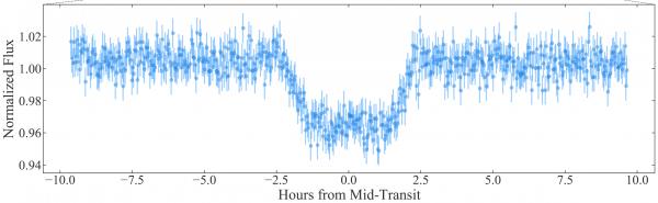 Il singolo transito di Toi-1899b osservato da Tess. Il calo della luminosità della stella nana di tipo M Toi-1899 è il segno rivelatore di un oggetto in orbita che attraversa il suo disco. La caratterizzazione dettagliata dell’oggetto è stata ottenuta grazie ai dati dallo spettrografo Planet Finder del telescopio Hobby-Eberly all’Osservatorio McDonald in Texas, confermandone la natura planetaria. Crediti: Caleb Cañas, Penn State