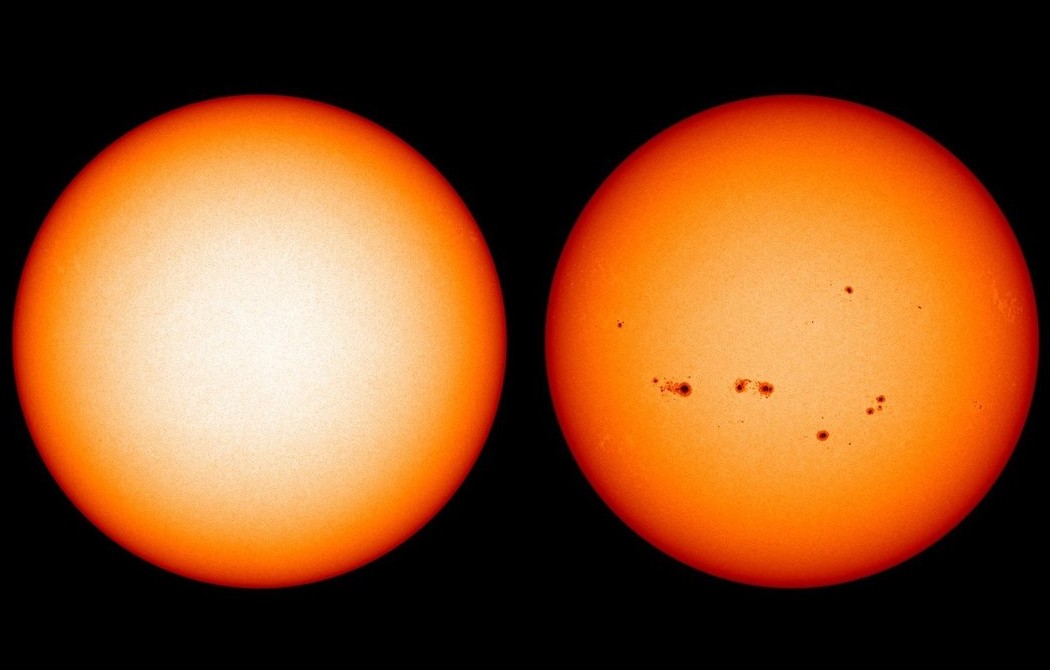 Durante il minimo solare del dicembre 2019 (a sinistra), sulla superficie del Sole non è visibile una singola macchia solare. In passato, durante il massimo solare avvenuto nel mese di luglio 2014 (a destra), diverse macchie solari erano ben visibili. Crediti: Nasa/Sdo/Joy Ng