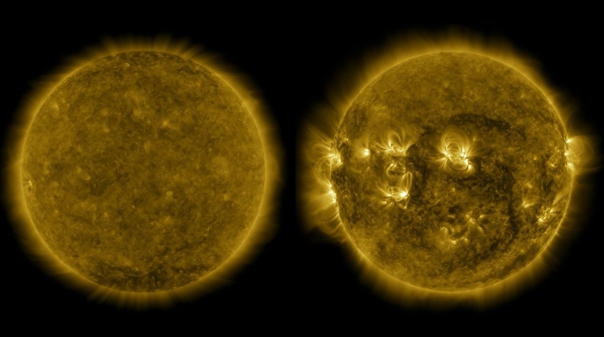 Come si può vedere in queste immagini ultraviolette, l’atmosfera del Sole mostra il suo lato monotono durante il minimo solare (a sinistra, dicembre 2019) e un livello molto più alto di attività durante il massimo solare (a destra, aprile 2014). Crediti: Nasa/Sdo/Joy Ng