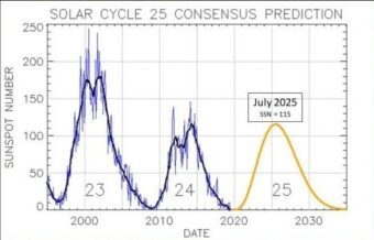 A tal proposito, il nuovo ciclo solare dovrebbe dare pochi motivi di preoccupazione. Il Prediction Panel prevede che sia simile al suo piuttosto debole predecessore. La forza dei cicli solari ha mostrato una chiara tendenza al ribasso dagli anni ’80. «Come sembra, l’attuale periodo di bassa attività solare, rispetto ai cicli intensi della maggior parte degli ultimi 50 anni, continuerà nei prossimi undici anni», afferma Cameron. Il prossimo massimo solare, piuttosto debole, dovrebbe verificarsi tra novembre 2024 e marzo 2026.