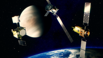 Immagine che mostra Akatsuki, BepiColombo e Hisaki (da sinistra a destra) in prossimità di Venere. Crediti: Jaxa