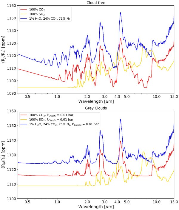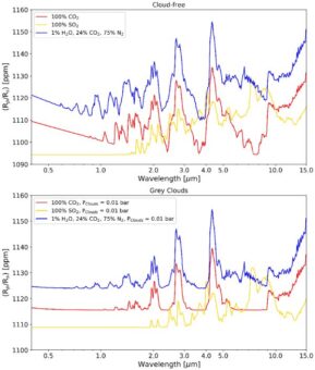 La figura mostra gli spettri sintetici prodotti per l’atmosfera di Gj 357 b. I tre colori identificano le tre diverse composizioni: 100 per cento CO2 in rosso, 100 per cento SO2 in giallo, e 75 per cento N2, 24 per cento CO2 e 1 per cento H2O in blu. Gli spettri sintetici sono calcolati sia nel caso di un’atmosfera priva di nubi (pannello in alto) che di nubi alla pressione di 0.01 bar (pannelli in basso). Crediti: D. Modirrousta-Galian et a., A&A 2020
