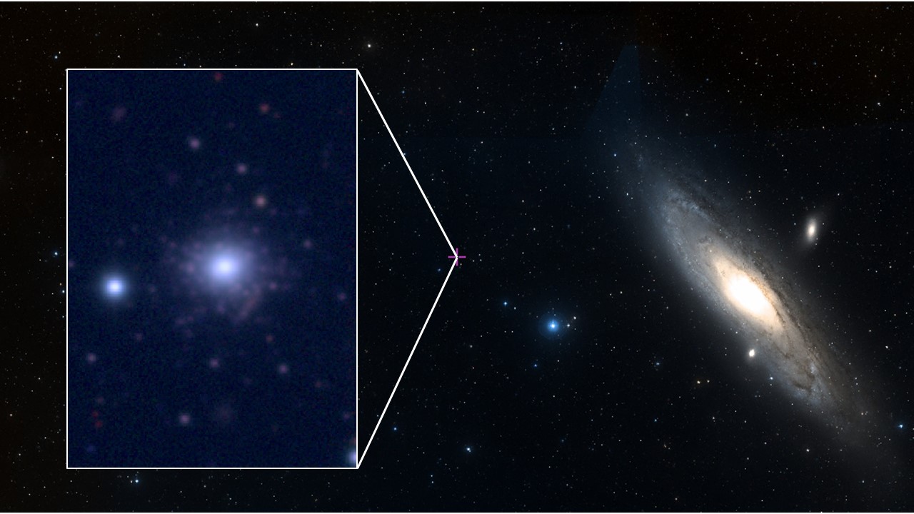 La galassia di Andromeda con l’ammasso globulare Rbc Ext8, povero di “metalli” (ovvero, di elementi più pesanti di elio e idrogeno). Crediti: EsaSky e Cfht