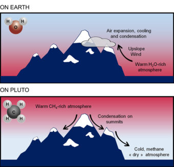 A causa della sua dinamica particolare, l’atmosfera di Plutone è ricca di metano allo stato gassoso ad altitudini elevate. Ne risulta che solo sui picchi delle montagne più alte l’aria contiene abbastanza metano per far sì che questo riesca a condensarsi, mentre a quote più basse ne contiene troppo poco per portare alla formazione di ghiaccio. Il nuovo studio potrebbe anche spiegare l’abbondanza di crinali scoscesi osservata sugli spessi ghiacciai di metano in altri punti di Plutone, non riscontrata invece sui ghiacciai terrestri, che sono composti di acqua e hanno un aspetto piuttosto levigato.