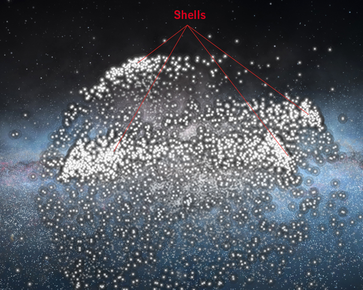 Le stelle identificate nella ricerca hanno formato “strutture a guscio” in seguito a una fusione radiale avvenuta 3 miliardi di anni fa. Crediti: Rensselaer Polytechnic Institute