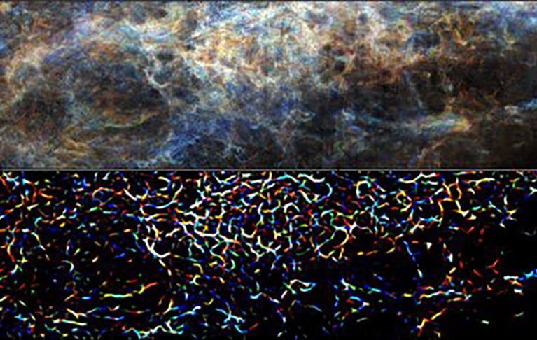 Emissione di idrogeno atomico da una porzione della survey Thor (in alto) e strutture filamentose associate attorno al filamento di Magdalena (in basso). Crediti: J. Soler et al. 2020