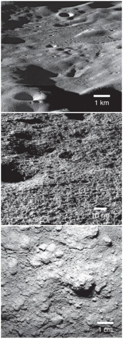 Ombre sulla Luna di diverse dimensioni: nell’ordine dei chilometri quelle (in alto) viste con il Lunar Reconnaissance Orbiter; delle decine di metri quelle (al centro) immortalate dal rover Yuto della missione cinese Chang’e-3; e dei centimetri quelle (in basso) riprese in dettaglio da Apollo 14. Crediti: P. O. Hayne et al., Nature Astronomy, 2020