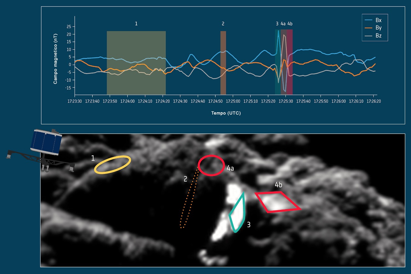 Crediti per le immagini: Esa / Rosetta / Mps For Osiris Team Mps / Upd / Lam / Iaa / Sso / Inta / Upm / Dasp / Ida; dati: Esa / Rosetta / Philae / Romap; analisi: O’Rourke et al. (2020); versione italiana a cura dell’ufficio stampa Inaf