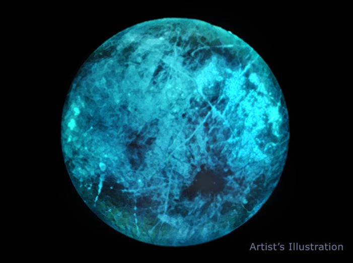 Questa illustrazione della luna di Giove – Europa – mostra come la superficie ghiacciata possa brillare sul lato notturno, il lato opposto al Sole. Nuovi esperimenti di laboratorio hanno ricreato l’ambiente di Europa e hanno permesso di scoprire che la luna ghiacciata brilla, anche sul lato notturno, a causa del ghiaccio. Quando Giove bombarda Europa con radiazioni e particelle cariche altamente energetiche, gli elettroni penetrano nella superficie, energizzando le molecole sottostanti. Quando quelle molecole si rilassano, rilasciano energia sotto forma di luce visibile. Variazioni nel bagliore e nel colore del bagliore stesso, potrebbero rivelare informazioni sulla composizione del ghiaccio sulla superficie di Europa. Diversi composti salini reagiscono in modo diverso alle radiazioni ed emettono il loro bagliore unico. Il colore varierà in base alla composizione reale della superficie di Europa. Crediti: Nasa/Jpl-Caltech