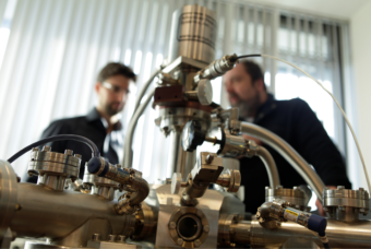 Sullo sfondo, Harold Linnartz (a destra), capo del Laboratorio di Astrofisica all’Osservatorio di Leiden, Paesi Bassi, e Sergio Ioppolo discutono i futuri sviluppi della configurazione del vuoto ultraelevato, Surfreside2, che permette di studiare l’accrescimento (simultaneo) di H/D, O, N, frammenti molecolari e molecole su una superficie a 10 K. Crediti: Sergio Ioppolo