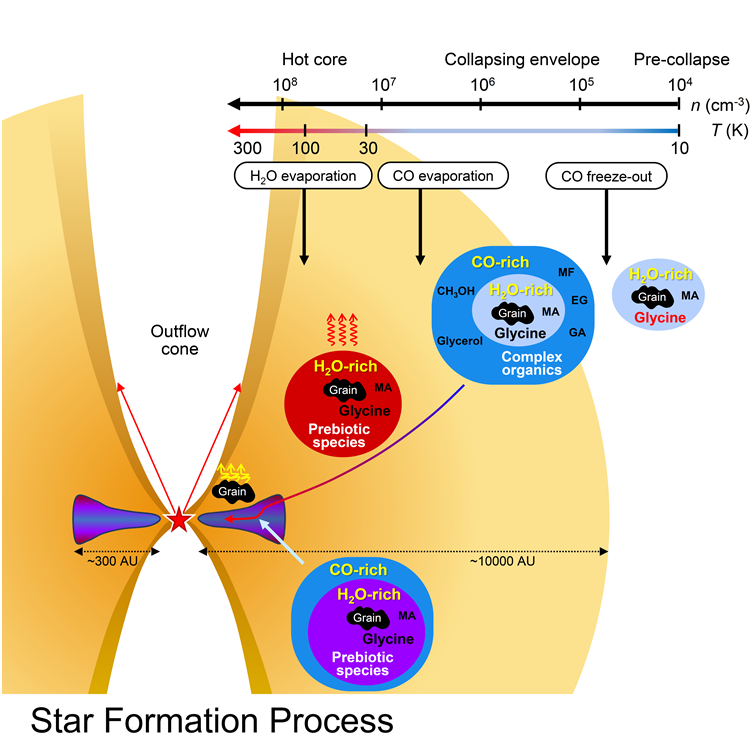 «In nubi interstellari dense, grani ghiacciati, che sono protetti da luce ultravioletta proveniente da stelle esterne, sono costantemente bombardati da atomi e molecole che vi si depositano sopra innescando una serie di reazioni chimiche di superficie. In queste nubi interstellari non vi sono ancora protostelle nascenti che potrebbero emettere luce ultravioletta, perché tali oggetti si formano a seguito del collasso gravitazionale delle nubi suddette».