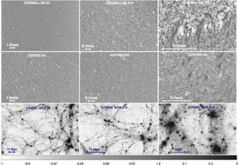 Mappe del contrasto di densità per sezioni di cervelletto (prima riga), della corteccia cerebrale (seconda riga) e della distribuzione di materia oscura nella struttura cosmica su grande scala (terza riga), corrispondenti a diversi livelli di ingrandimento (4x a sinistra; 10x al centro; 40x a destra). Lo studio si è concentrato principalmente sulle immagini della colonna di destra. Crediti: Vazza & Feletti, 2020