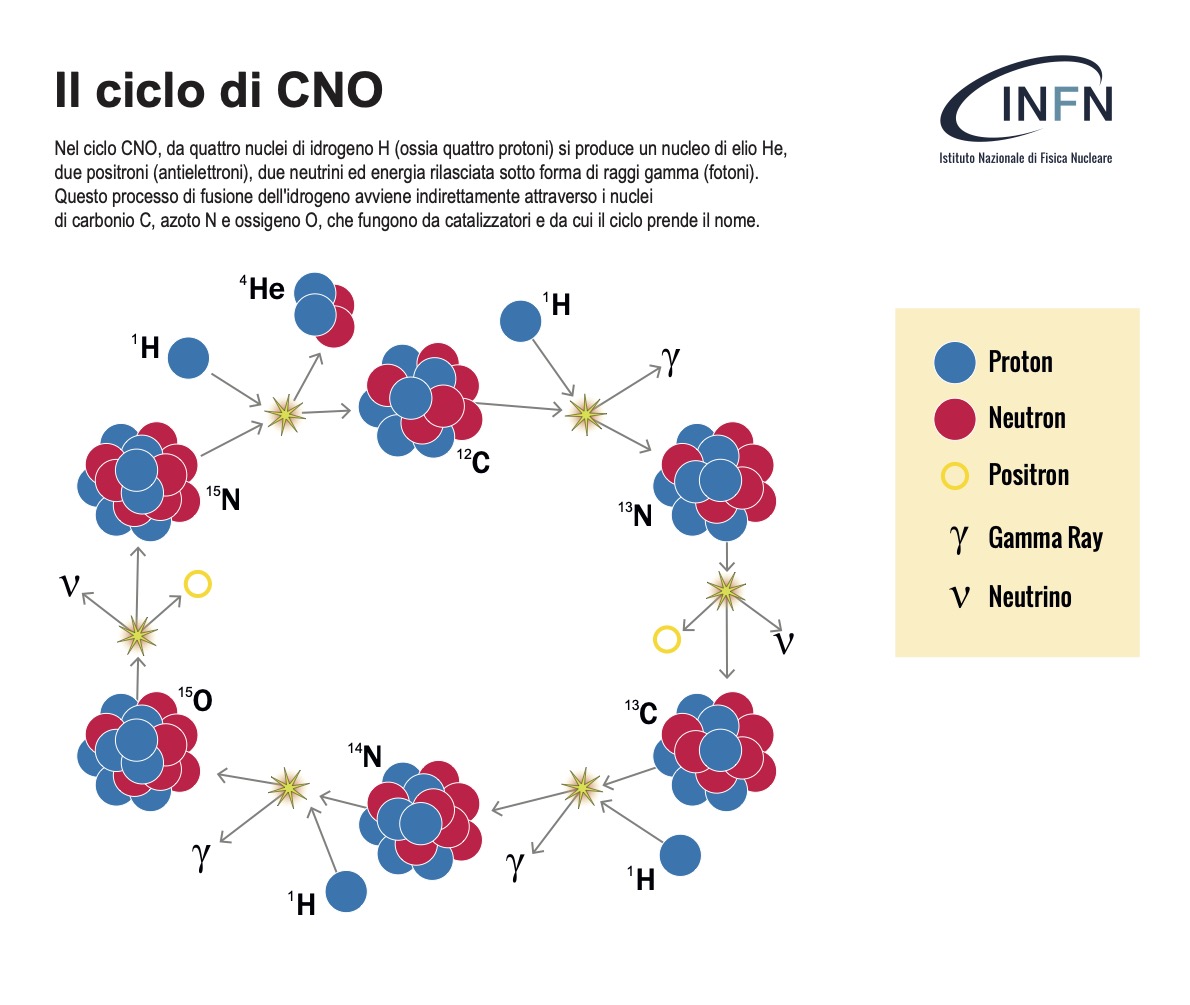 La collaborazione scientifica Borexino, esperimento ai Laboratori nazionali del Gran Sasso dell’Istituto nazionale di fisica nucleare, pubblica oggi su Nature l’annuncio della prima rivelazione in assoluto dei neutrini prodotti nel Sole dal ciclo CNO (carbonio-azoto-ossigeno): un risultato sperimentale di valore storico, che completa un capitolo della fisica iniziato negli anni ’30 del secolo scorso. L’implicazione di questa nuova misura per la comprensione dei meccanismi stellari è enorme: infatti, poiché il ciclo CNO è preponderante nelle stelle più massicce del Sole, con questa osservazione Borexino ha raggiunto l’evidenza sperimentale di quello che di fatto è il canale dominante nell’universo per la combustione dell’idrogeno.