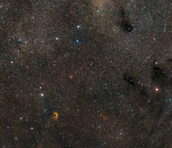 Questa vista ad ampio campo mostra il cielo intorno alla posizione della storica stella esplosiva Ck Vulpeculae. I resti della nova sono visibili solo molto debolmente al centro dell’immagine. Crediti: Eso / Digitalized Sky Survey 2