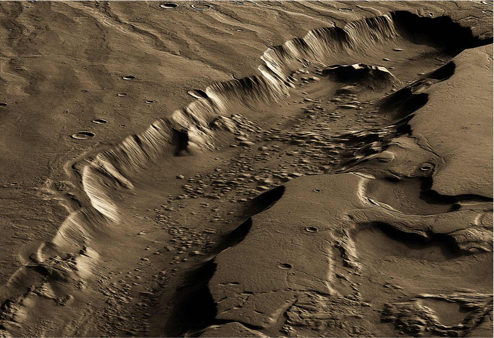 Una vista esasperata verticalmente e in falsi colori di un grande canale marziano, scolpito dall’acqua, chiamato Dao Vallis. Crediti: Esa/Dlr/Fu Berlin, Cc By-Sa 3.0 igo. 3D rendering e colori a cura di Lujendra Ojha
