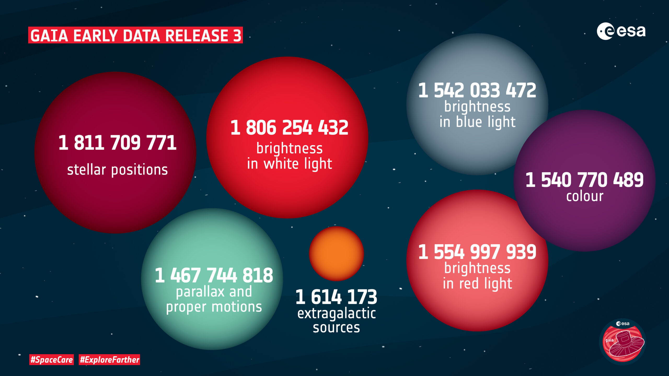 La Early Data Release 3 rappresenta il miglior catalogo astrometrico e fotometrico stellare di sempre. I ricercatori sono già al lavoro da mesi per realizzare la versione completa del terzo catalogo (Gaia Data Release 3), il cui rilascio è previsto per il 2022, con una serie di dati aggiuntivi tra cui la classificazione dei sistemi binari di stelle, e un catalogo esteso di asteroidi nel Sistema solare. Il satellite continuerà a raccogliere dati per almeno altri due anni (e indicativamente fino alla fine del 2025) e seguiranno ulteriori cataloghi man mano che i nuovi dati vengono processati e analizzati.