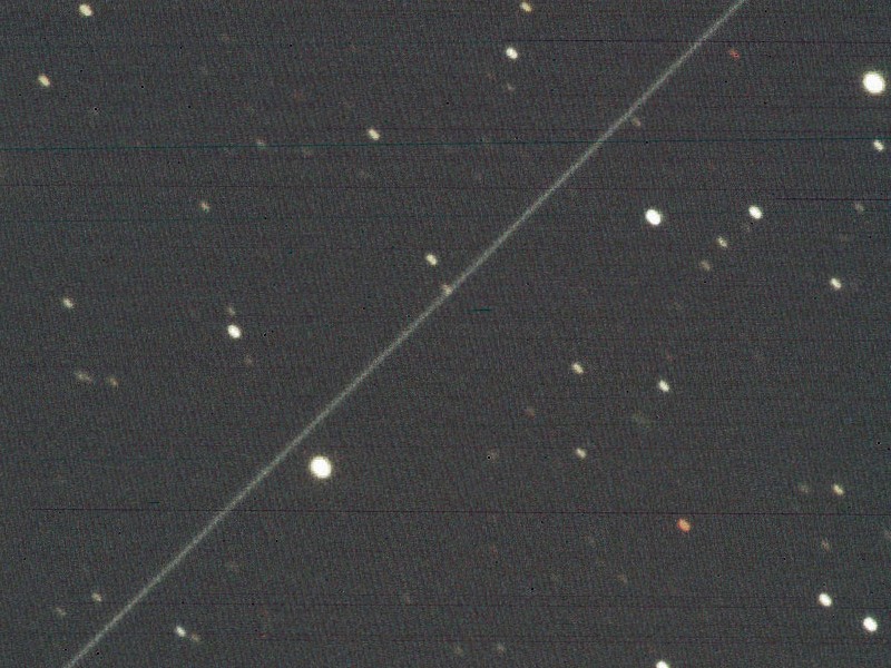 La traccia di un satellite Starlink (la linea che parte dall’alto a destra, verso il basso a sinistra) catturata dal Telescopio Murikabushi il 10 aprile 2020. Crediti: Naoj