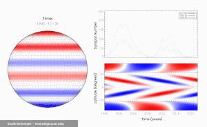 A sinistra, l’animazione mostra le bande magnetiche a carica opposta, rappresentate in rosso e blu, mentre si muovono verso l’equatore in un arco temporale di 22 anni. Quando si incontrano all’equatore, si annientano a vicenda. A destra, l’animazione in alto mostra il numero totale delle macchie solari (in nero) e i contributi degli emisferi nord (rosso) e sud (blu). La parte inferiore mostra la posizione delle macchie. Crediti: Scott McIntosh