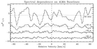 Lo spettro risultante da 4 diverse selezioni della baseline di Alma (distanziati verticalmente per chiarezza). Dall’alto al basso: tutti i dati; solo dati da coppie di antenne con separazione maggiore di 20 m; maggiore di 33 m; maggiore di 50 m. Solo lo spettro basato sui dati con separazione superiore a 33 m mostra un decremento al centro con rapporto segnale-rumore di circa 2. Crediti: Snellen et al., 2020