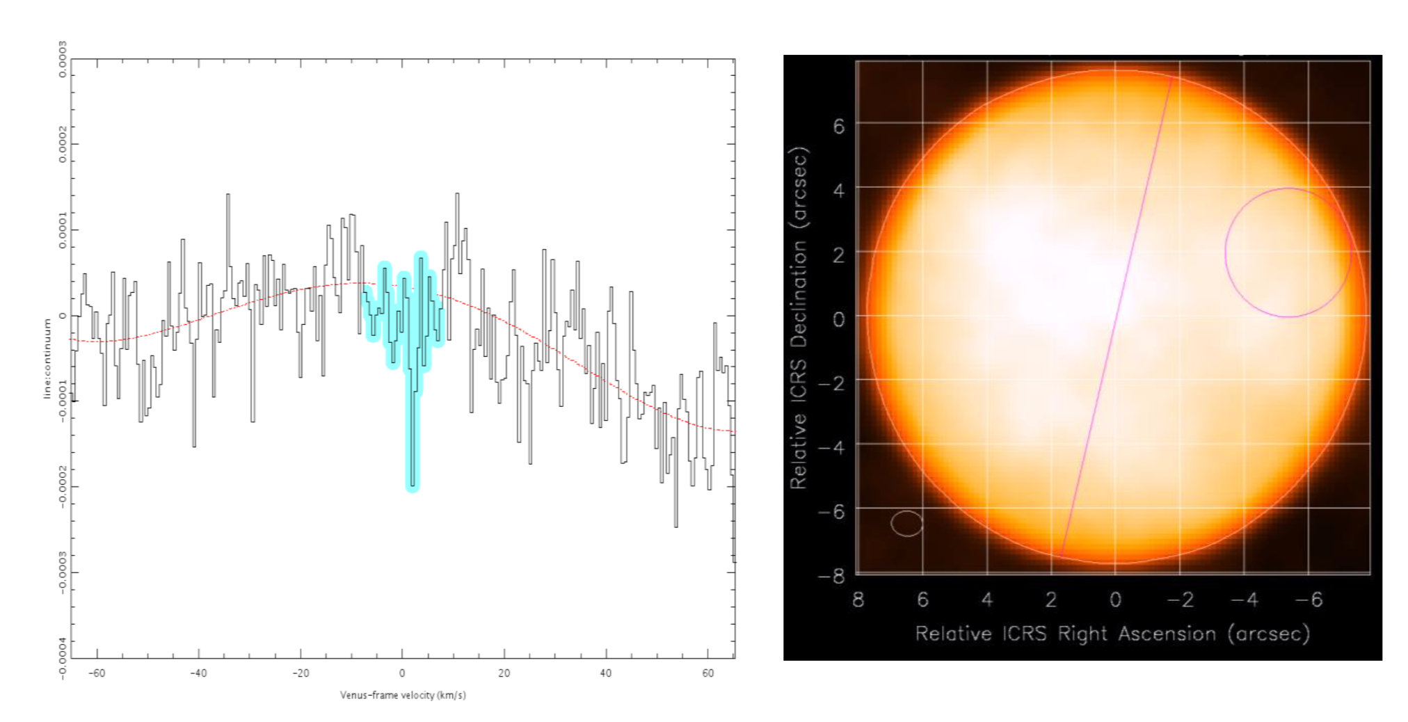 Esempio di uno spettro con presunti segni di fosfina, estratto dalla regione cerchiata super-imposta sull’immagine del continuo. Crediti: Greaves et al. 2020 (arXiv:2011.08176)