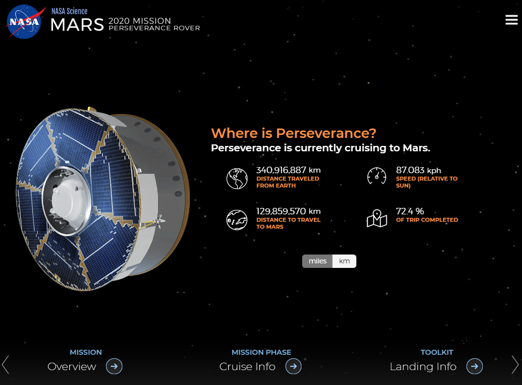 Screenshot dell pagina https://mars.nasa.gov/mars2020, dove potete trovare tutte le informazioni su Perseverance, compresa la sua attuale posizione. Crediti: Nasa/Jpl-Caltech.