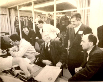 Wallops Island, 14 dicembre 1964. Seduti da sinistra a destra ci sono Michele Sirinian, Luigi Broglio e Carlo Buongiorno, altro personaggio chiave nello sviluppo delle scienze spaziali in Italia.. Fonte: archivio personale di Carlo Buongiorno