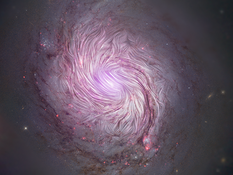 È evidente come tali campi si allineano lungo tutta la lunghezza dei massicci bracci a spirale – la galassia ha un diametro di 24mila anni luce, circa un quarto del diametro della nostra – il che implica che le forze gravitazionali che hanno dato forma alla galassia stessa stanno comprimendo anche il suo campo magnetico. Questa evidenza supporta la teoria delle onde di densità, secondo la quale i bracci a spirale sono costretti nella loro iconica forma.